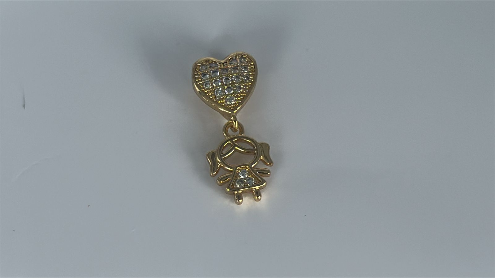 PINGENTE EM FORMATO DE MENINA COM DETALHE DE CORAÇÃO, REPRESENTANDO AMOR, CARINHO E CONEXÃO FAMILIAR COM UM TOQUE ROMÂNTICO E DELICADO.